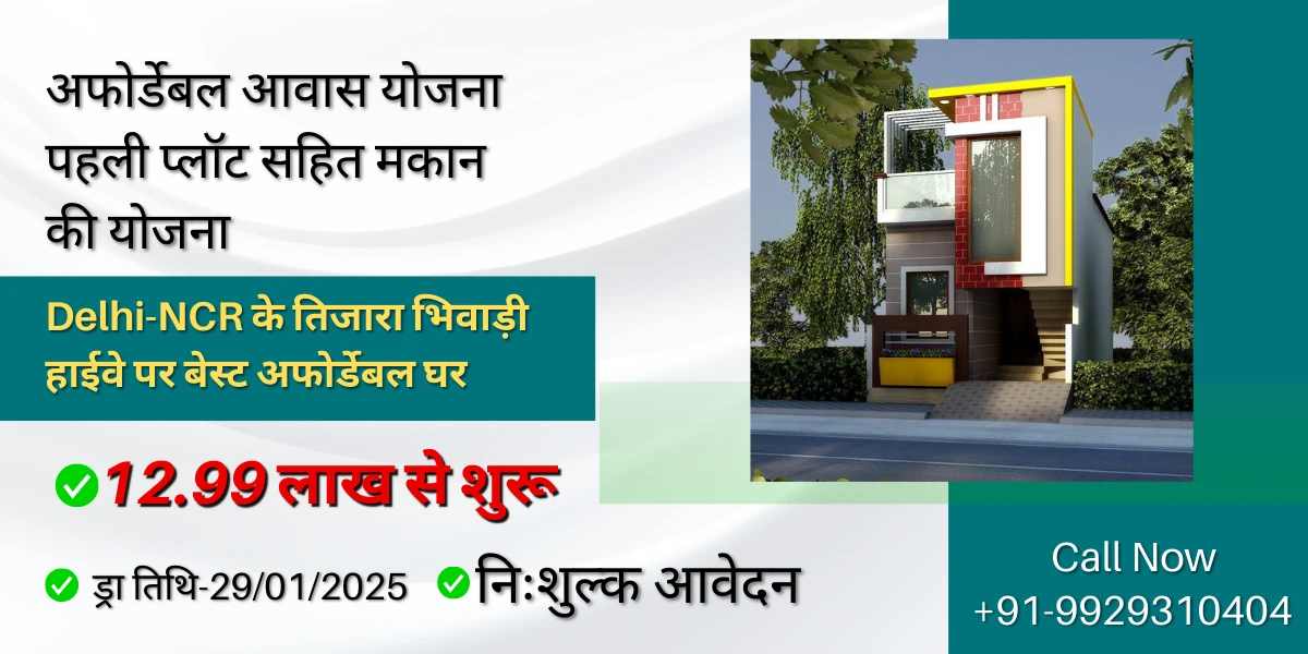 अफोर्डेबल जन आवास योजना के तहत विकासकर्ता NCR Affordable Homes के राजस्थान राज्य सरकार के साथ हुए अनुबंध के तहत 1 BHK व 2 BHK वर्ग के प्लॉट साहित्त मकान की यह योजना तिजारा भिवाड़ी हाईवे पर बनाई जा रही है। इस योजना में 1 BHK व 2 BHK वर्ग के प्लॉट साहित्त मकान के ड्रा द्वारा आवंटन हेतु आवेदन पत्र आमंत्रित किये जा रहे हैं।